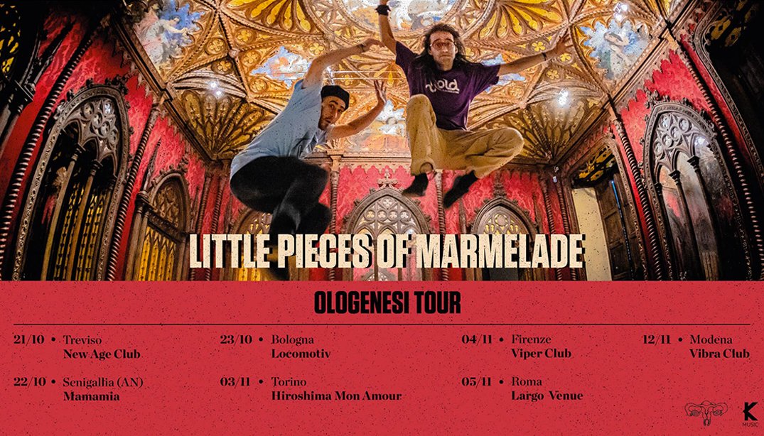 Little Pieces Of Marmelade: torna il duo che si è fatto conoscere al grande pubblico arrivando secondo a XFactor 2020! Dopo essere stati in classifica per settimane nella Global Rock di Spotify con “One Cup of Happiness”, tornano il 7 ottobre con il nuovo album “Ologenesi “, prodotto da Manuel Agnelli e anticipato dai singoli “Canzone 7 ” e “Canzone 10”. La band sarà in tour a partire dal 21 ottobre.
