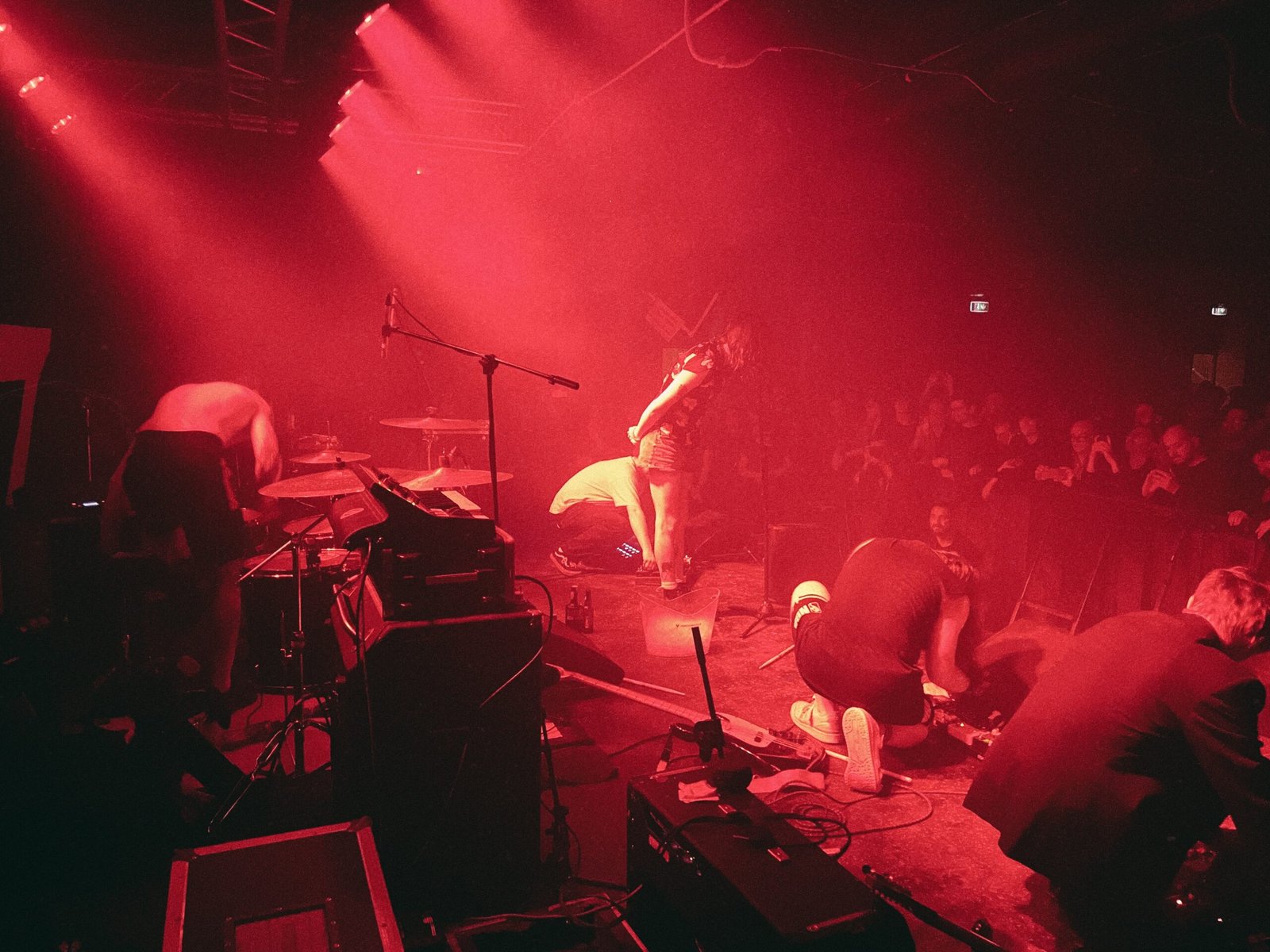 Il live si snoda lungo un tragitto irto di riff corrosivi e deviazioni industrial che esplodono, destrutturando il suono in vertigini claustrofobiche, trascinate da ritmiche che hanno la potenza di vibrarci nello stomaco. Mentre veniamo tutti travolti da questa schizofrenia no-wave abrasiva e delirante, sempre il portento Cal, uno sgraziato Ladyboy col timbro di Tom Waits (come cita la sua bio sui social) si lancia in andirivieni di stage diving, appende il microfono all’Americana sopra il palco, mette il ghiaccio sui piatti della batteria, offre il vino e, come un direttore d’orchestra, direziona il moschpit sotto le luci febbricitanti del locale.