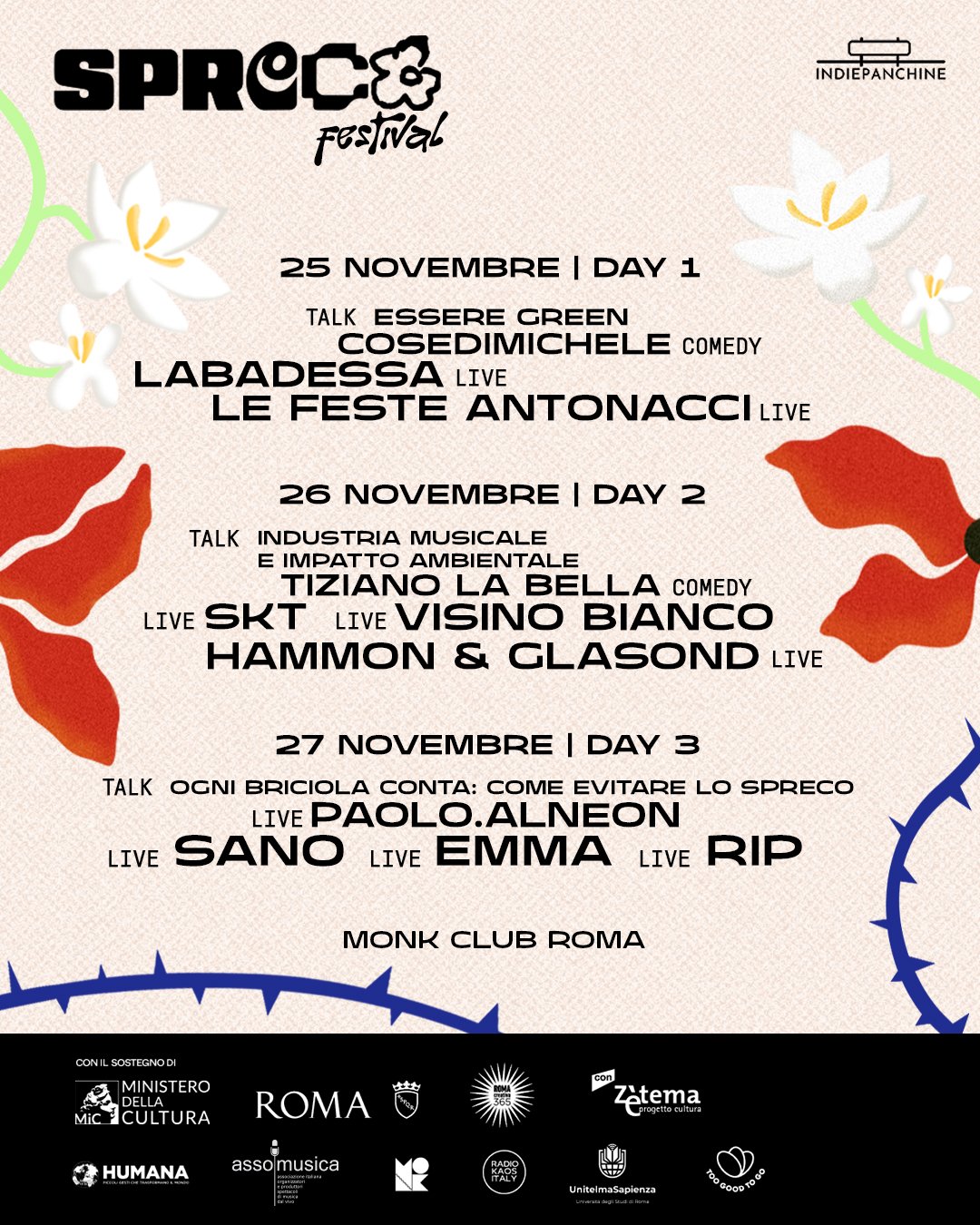Al via da martedì 25 a giovedì 27 novembre 2025 presso il Monk Club di Roma, la seconda edizione di SpEco Festival, la rassegna ideata da Indiepanchine in partnership con Unitelma Sapienza, Assomusica, Humana People to People Italia, Too Good To Go, Monk Club, Radio Kaos Italy che trasmetterà il festival in diretta radiofonica, e presentato da Riccardo Zianna.