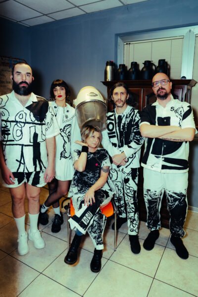 Allora, sono dei disegni fatti da questa ragazza che si chiama Sara, di un brand che si chiama A.D.D.O.S.S.O. È un brand fatto in casa, possiamo dire. Lei prende i vestiti e ci disegna sopra. Le è stato consegnato il disco prima dell’uscita per farle capire che tipo di sonorità e che tipo di attitudine fosse quella giusta per rappresentarci esteticamente. La voglia di essere, tra virgolette, in divisa – anche se ci piace, più che in divisa, pensare che siamo in costume, e di essere un gruppo anche da questo punto di vista – è una cosa che era un desiderio un po’ di tutti. Avevamo voglia di questa cosa, era come se fosse diventato un pensiero condiviso ancora prima di dircelo. Quando uno l’ha detto, gli altri erano già d’accordo. Quando è arrivata l’idea che sarebbe stato figo essere tutti insieme in costume ci siamo messi a cercare qualcuno che potesse realizzarla. E l’idea, chiaramente, c’è venuta un po’ all’ultimo, tra l’altro nel periodo di Natale, quindi c’erano di mezzo le vacanze natalizie. E lei è stata mitica perché sotto Natale e Capodanno si è messa a lavorare e ci ha consegnato tutto prima della prima data. È stata veramente stupenda.