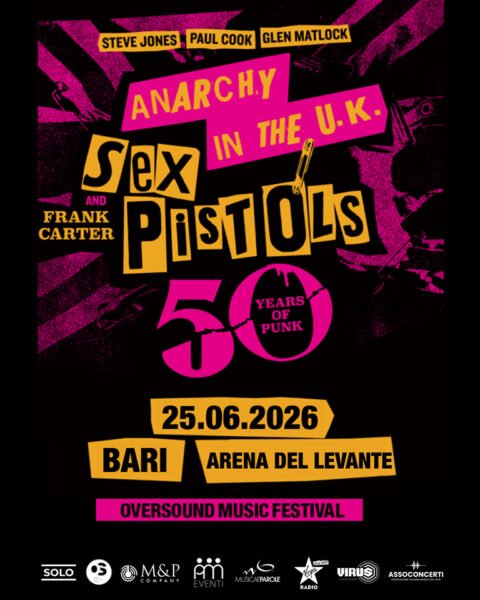 Glen Matlock, Paul Cook e Steve Jones tornano dal vivo in Italia insieme a Frank Carter! Si esibiranno giovedì 25 giugno 2026 all’Oversound Music Festival di Bari, presso l’Arena del Levante. I biglietti sono già acquistabili sui circuiti ufficiali Ticketone, Vivaticket e Ticketsms. Virgin Radio è la radio ufficiale del concerto dei Sex Pistols Featuring Frank Carter.