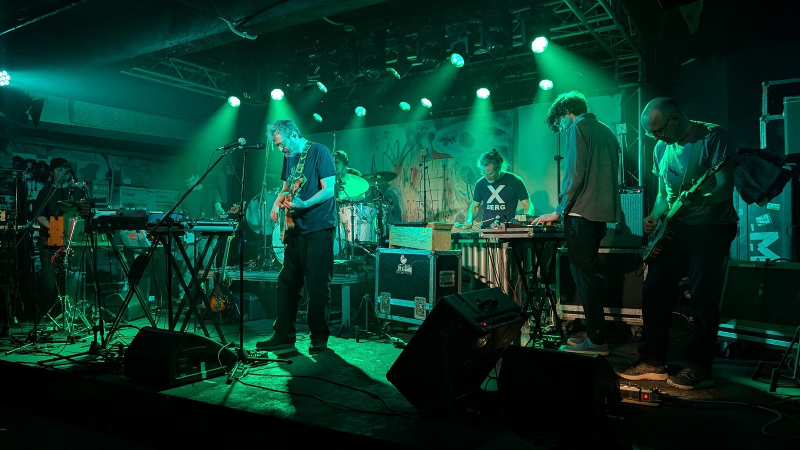 Il viaggio dei The Notwist sul palco del Monk, dopo la lunga e onirica coda strumentale degli scozzesi A Happy Return, è alternanza tra allucinazioni sonore esplosive, impulsi di loop infiniti, scosse elettriche, ruvide trame synth-etiche, morbide visioni universali e macchie di melodia che accolgono in un unico abbraccio la voce sussurrata, quasi imprendibile di Markus Acher. Attorno a lui c’è un tripudio di suoni e di strumenti di ogni tipo che, come in un dipinto orchestrale opalescente, vengono orlati da luci a intermittenza, in discontinui bagliori che seguono i movimenti ritmici del suono stesso. Tra gli scintillii compositivi e gli energici muri sonori, chitarre, basso e batteria si fondono a clarinetti, tromboni, vibrafoni, taishōgoto e harmonium, creando codici indissolubili, modellando legami in modo suggestivo e totalizzante, in un denso magma di suoni che attraversa tutte le sfumature della band, dagli esordi fino ad oggi, dall’attitudine più punk, passando per l’elettronica, il kraut, il folk soffuso e l’alternative indie, fino alla sperimentazioni più recenti.