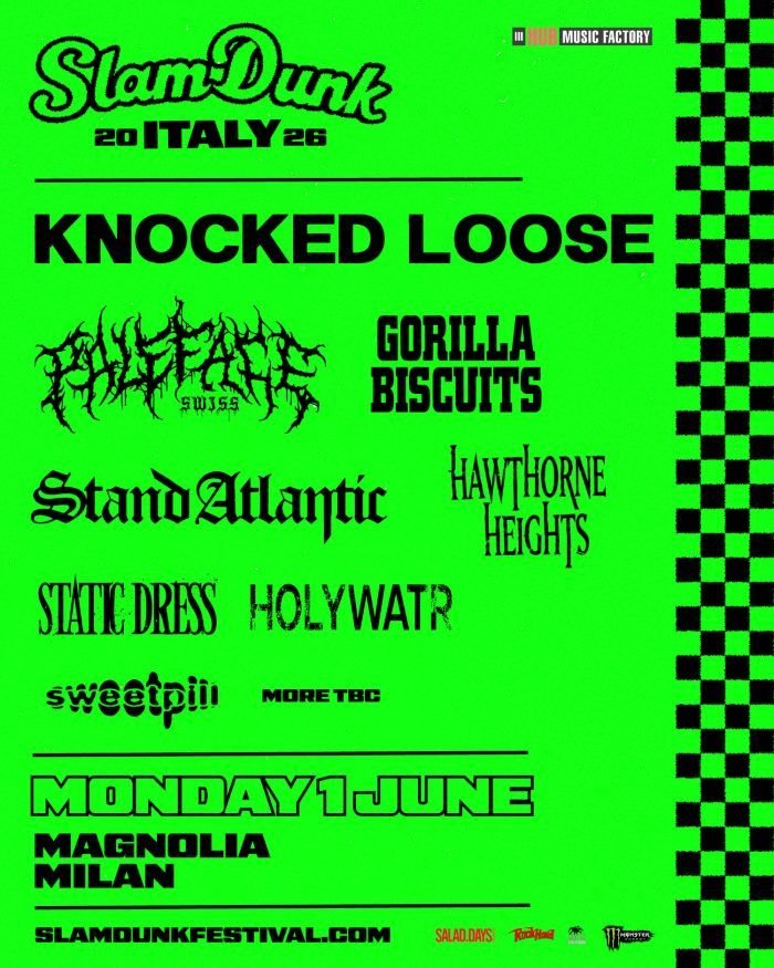 Slam Dunk conferma così la propria presenza nel calendario italiano, consolidando un format che punta sulla varietà e sull’equilibrio tra nomi affermati (tra cui KNOCKED LOOSE, PALEFACE SWISS, GORILLA BISCUITS, STAND ATLANTIC) e nuove proposte.